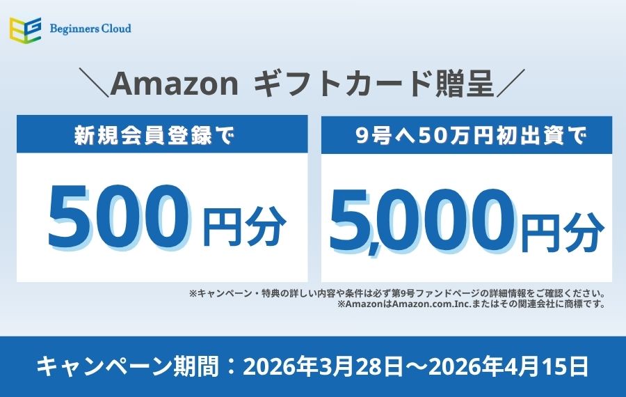 | 条件・内容 | 9号ファンドに50万円以上出資かつ初出資でAmazonギフト5,000円分プレゼント |